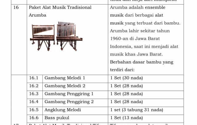 Arumba yang merupakan kepanjangan dari alunan rumpun bambu the rhythm of bamboos dikembangkan oleh udjo ngalagena pada tahun 1971. Kendang adalah sejenis alat musik perkusi yang membrannya berasal dari kulit hewan. Alat musik ini barasal dari pulai nias yang biasa dimainkan oleh masyarakat setempat pada acara perkawinan.