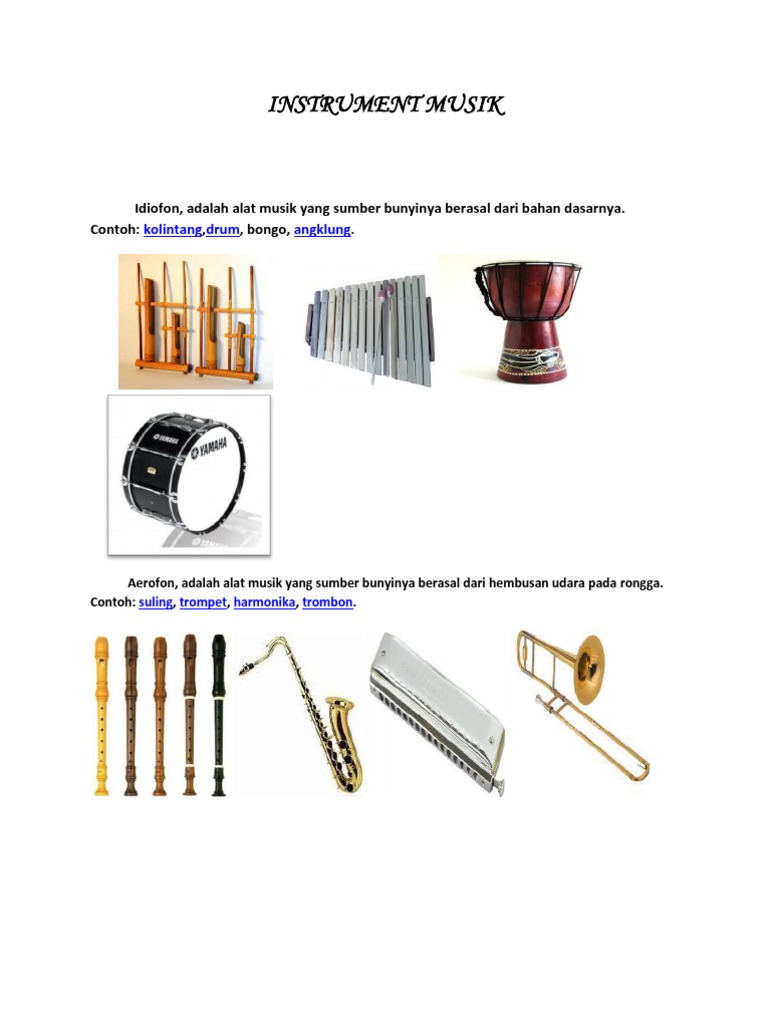 Suling trompet harmonika trombon. Aerofon adalah alat musik yang sumber bunyinya berasal dari hembusan udara pada rongga. Kordofon chordophone adalah sebuah alat musik berdasarkan instrument yang sumber bunyinya berasal dari dawai atau senar yang terdapat pada bagian alat musik itu sendiri.